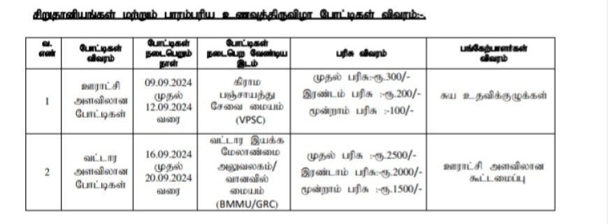 எனவே மேற்காணும் விவரப்படி நடைபெறவுள்ள போட்டிகளில் சுய உதவிக்குழு உறுப்பினர்கள் பங்கேற்று இரத்தசோகை /ஊட்டச்சத்து குறைபாடு இல்லாத குடும்பங்கள் மற்றும் கிராமங்களை உருவாக்கவும் மற்றும் உணவு மற்றும் ஊட்டச்சத்து குறித்து விழிப்புணர்வை ஏற்படுத்திட உறுதுணையாக இருக்க வேண்டும்.