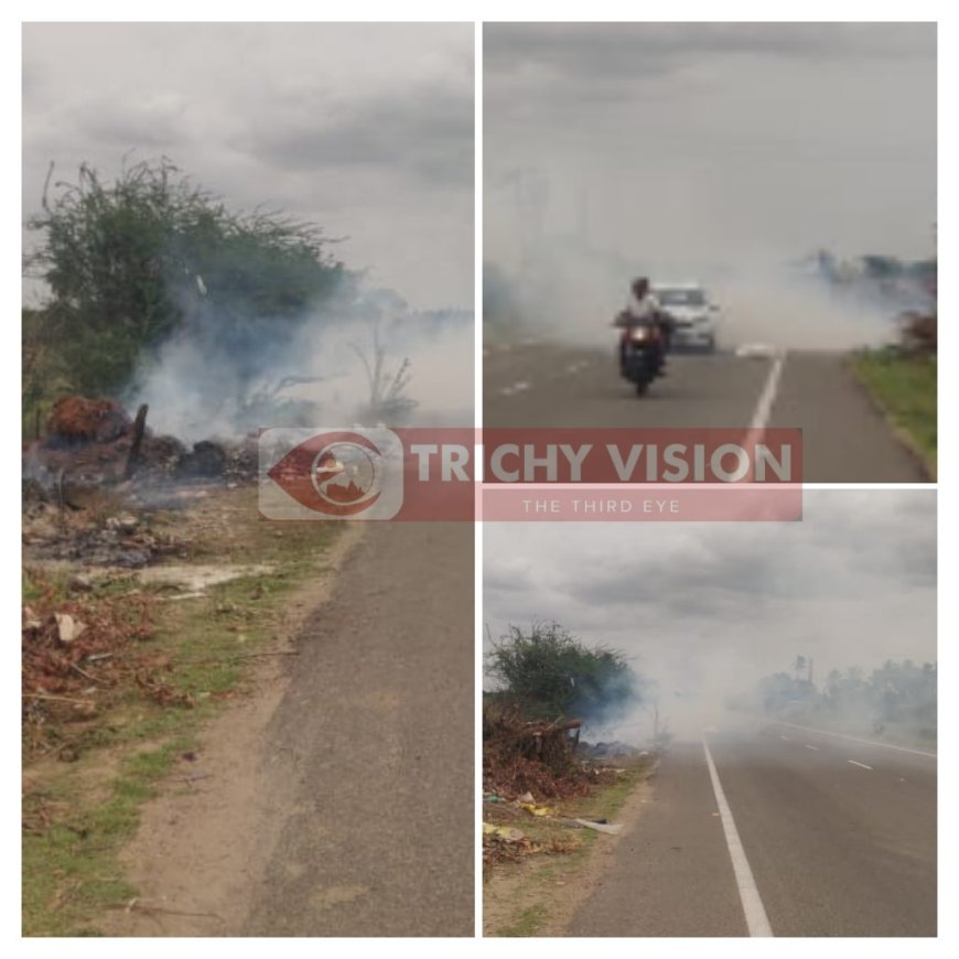 புதுக்கோட்டையில் இருந்து மதுரை வரும் வாகனங்களும், மதுரை சாலையில் இருந்து புதுக்கோட்டை, தஞ்சாவூர் செல்லும் வாகனங்களும் இந்த சாலையை கடந்து செல்ல வேண்டி உள்ளது. அதிகளவில் புகை மூட்டத்துடன் சாலை காணப்படுகிறது. அளவுக்கு அதிகமாக குப்பைகள் எரிந்து புகை மூட்டமாக உள்ளது. அந்த சாலையில் வாகனங்கள் அதிக வேகமாக வருகின்றன. எதிரே வரும் வாகனங்கள் தெரியாத நிலையில் விபத்து ஏற்படும் வாய்ப்பு ஏற்பட்டுள்ளது.
