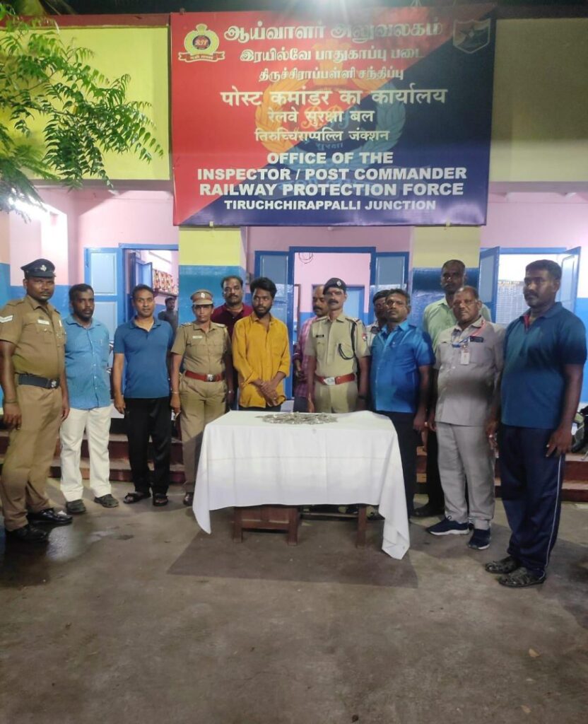 திருச்சி ஜங்ஷன் ரெயில் நிலையத்தில் அரசால் தடை செய்யப்பட்ட புகையிலை பொருட்கள், கஞ்சா போன்றவை கடத்தப்படுவதை தடுக்கும் விதமாக ரெயில்வே பாதுகாப்பு படையினர் பல்வேறு நடவடிக்கைகளை மேற் கொண்டு வருகிறார்கள்.