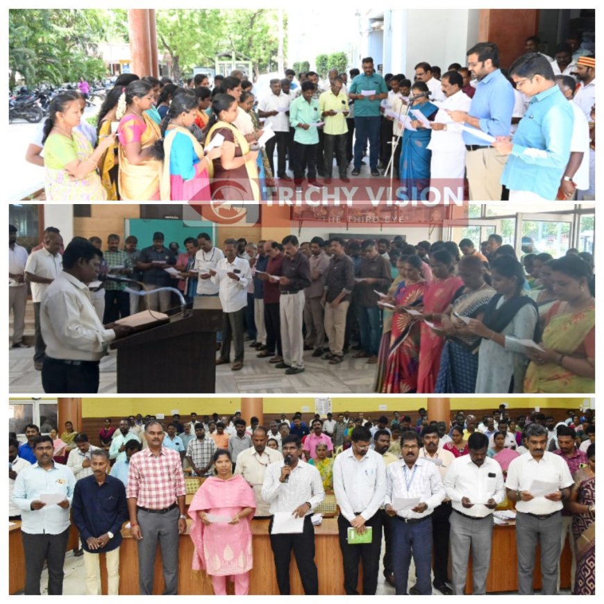 திருச்சிராப்பள்ளி மாவட்ட ஆட்சியர் அலுவலக கூட்டரங்கில் இன்று (16.09.2024) சமூக நீதி நாள் உறுதிமொழியினை மாவட்ட ஆட்சித்தலைவர் மா.பிரதீப் குமார் தலைமையில், அனைத்துத்துறை அரசு அலுவலர்கள் ஏற்றுக் கொண்டனர். அருகில், மாவட்ட வருவாய் அலுவலர் ர.ராஜலட்சுமி உள்ளிட்ட அரசுத்துறை அலுவலர்கள் கலந்து கொண்டனர்..