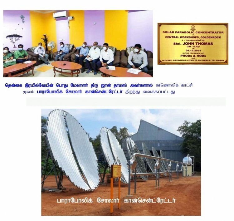 திருச்சி பொன்மலை ரயில்வே பணிமனையில் ரயில் இன்ஜின்கள் தயாரித்தல் மற்றும் பராமரிப்பு உள்ளிட்ட பல்வேறு பணிகள் மேற்கொள்ளப்பட்டு வருகின்றன. இங்கு எஞ்ஜின்களுக்கான உதிரிபாகங்களை வெப்ப நீரால் சுத்தப்படுத்துவதற்காக இதுவரை மின்ஹீடர்கள் பயன்படுத்தப்பட்டு வந்தன. அதற்கு பதிலாக பாராபோலிக் சோலார் கான்சென்ட்ரேட்டர் (சூரிய சக்தி) என்ற நீரை சூடாக்கும் புதிய யூனிட் நிறுவப்பட்டுள்ளது.