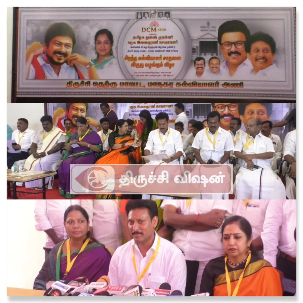 தமிழக துணை முதல்வர் 48 வது பிறந்தநாள் விழாவை முன்னிட்டு திருச்சி தெற்கு மாவட்ட திமுக சார்பில் சிறந்த கல்வியாளர் சாதனை விருது வழங்கும் விழா நடைபெற்றது . இந்த விழாவில் தமிழக பள்ளிக் கல்வித்துறை அமைச்சர் அன்பில் மகேஷ் கல்வியாளர் அணி மாநில செயலாளர் தமிழச்சி தங்கபாண்டியன் எம்பி பங்கேற்று பேராசிரியர்கள் மற்றும் ஆசிரியர்களுக்கு விருதுகள் வழங்கப்பட்டன
