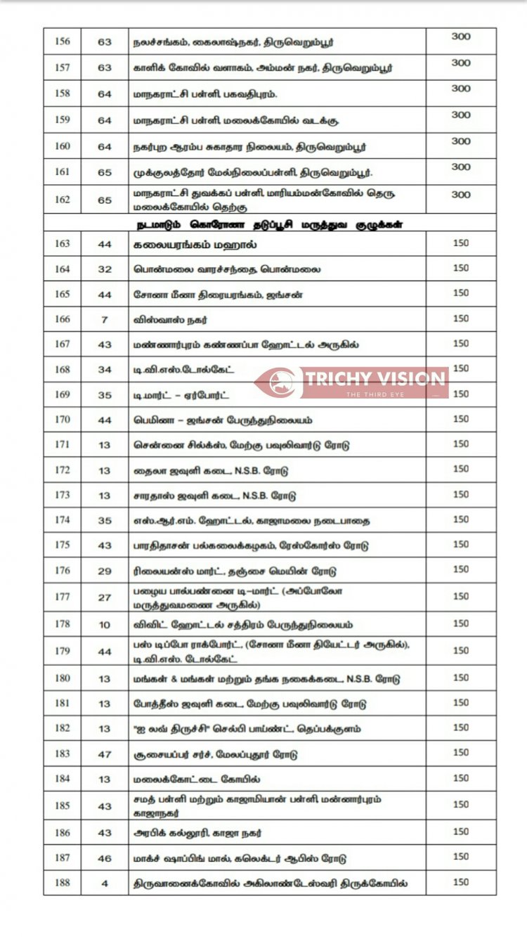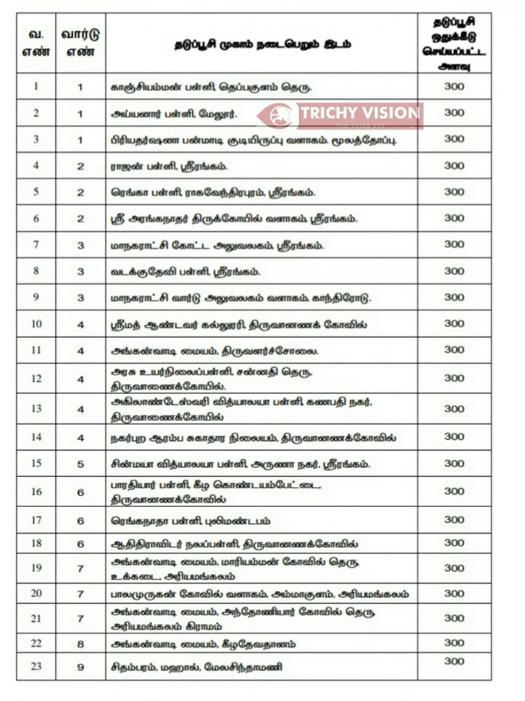 இந்நிலையில் தமிழகம் முழுவதும் 23.10.2019 அன்று மாபெரும் கொரோனா தடுப்பூசி முகாம்கள் நடத்த திட்டமிடப்பட்டுள்ளது. அதனை தொடர்ந்து திருச்சி மாநகராட்சியில் குறிப்பிட்டுள்ள 202 இடங்களில் நாளை (23.10.2021) காலை 7 மணி முதல் மாலை 7 மணி வரை மாபெரும் தடுப்பூசி முகாம் நடைபெற உள்ளது.