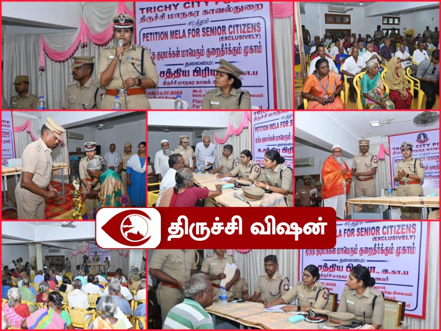 இதன்தொடர்ச்சியாக மூத்த குடிமக்களின் (Senior Citizen) நலனை கருத்தில் கொண்டும், அவர்களது குறைகளை போக்கும் வகையிலும் மூத்த குடிமக்களுக்கான சிறப்பு குறைதீர்க்கும் முகாம் (Senior Citizen Petition Mela) நடத்திட திருச்சி மாநகர காவல் ஆணையர் அவர்களின் உத்தரவின்பேரில் இன்று(14.07.23)-ந்தேதி காலை 10.00 மணிக்கு சத்திரம் பேருந்து நிலையம் அருகில் உள்ள ரவி மினிஹாலில் (கலைஞர் அறிவாலயம் அருகில்) நடைபெற்றது.