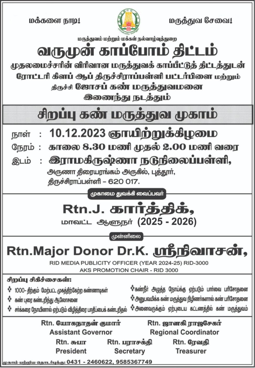 முதலமைச்சரின் விரிவான மருத்துவ காப்பீடு திட்டத்தின் ரோட்டரி கிளப் ஆப் திருச்சிராப்பள்ளி பட்டர்பிளை மற்றும் திருச்சி ஜோசப் கண் மருத்துவமனை இணைந்து நடத்தும் சிறப்பு கண் மருத்துவ முகாம்