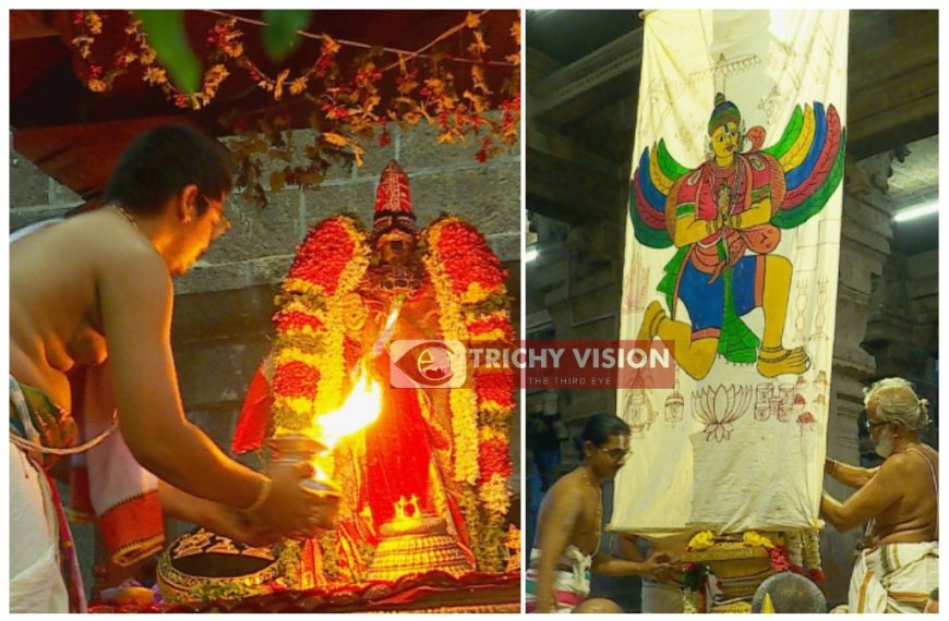 திருச்சி ஸ்ரீரங்கம் அரங்கநாதர் கோவில் ஆண்டு முழுவதும் திருவிழாக்கள் நடைபெறும். அந்த வகையில் சித்திரை தேர்த் திருவிழா கொடியேற்றத்துடன் தொடங்கியது. இதையொட்டி இன்று அதிகாலை 3:30 மணிக்கு நம்பெருமாள் மூலஸ்தானத்திலிருந்து புறப்பட்டு அதிகாலை 3:45 மணிக்கு கொடியேற்ற மண்டபம் வந்தார். பின்னர் காலை 5:30 மணி முதல் காலை 6:15 மணிக்குள் மேஷ லக்னத்தில் கொடியேற்றம் நடைபெற்றது.