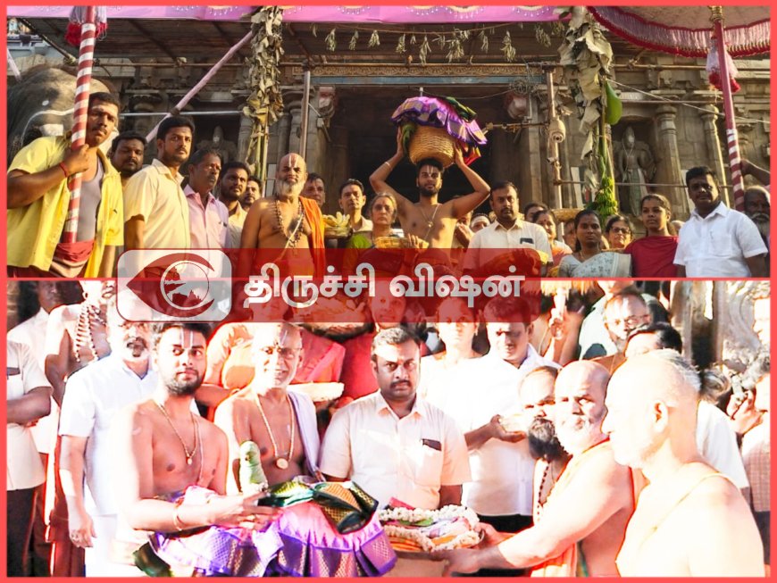 ஸ்ரீரங்கம் அருள்மிகு அரங்கநாத சுவாமி திருக்கோயிலில் நாளை 19.04.2023 புதன் கிழமை சித்திரை தேரோட்டத்தை முன்னிட்டு ஸ்ரீவில்லிபுத்தூர் அருள்மிகு ஆண்டாள் திருக்கோயிலில் இருந்து ஸ்ரீரங்கம் ஸ்ரீ நம்பெருமாளுக்கு பட்டு வஸ்திரங்கள் , கிளி மாலை ,மற்றும் மங்கல சீர்வரிசை பொருட்களை ஸ்ரீவில்லிபுத்தூர் திருக்கோயில் நிர்வாகம் சார்பில் அர்ச்சகர்கள் ரமேஷ் பட்டர் , சுதர்சன் பட்டர் மற்றும் திருக்கோயில் பணியாளர்கள் கொண்டு வந்து ஸ்ரீரங்கம் கோயில் இணை ஆணையர் செ. மாரிமுத்துவிடம் வழங்கினர்.