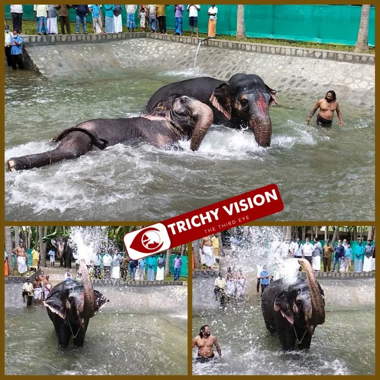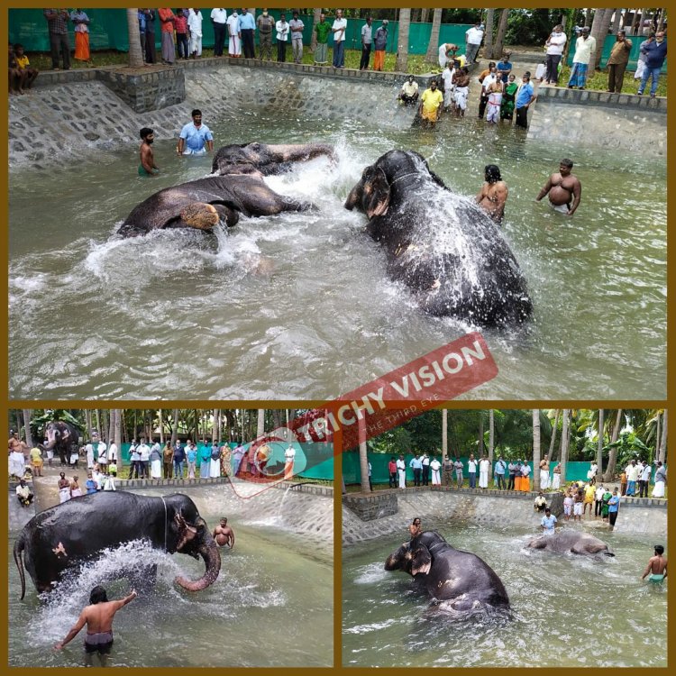 அந்த குளத்திற்க்கு இன்று (25.10.2021) காலை கோயில் அர்ச்சகர் சுந்தர் பட்டர் சிறப்பு பூஜை செய்யப்பட்ட பின்பு கோயில் இணை ஆணையர்  மாரிமுத்து முன்னிலையில் ஆண்டாள் மற்றும் லட்சுமி ஆகிய இரண்டு யானைகளும் முதன் முறையாக குளிக்க வைத்து பார்க்கப்பட்டது. லட்சுமி, ஆண்டாளும் நீச்சல் தொட்டியில் உற்சாக குளியல் போட்டது. நன்கொடையாளர் ஒருவரால் எட்டு லட்ச ரூபாய் செலவில் இந்த குளியல் தொட்டி கட்டப்பட்டதாக தெரிகிறது.