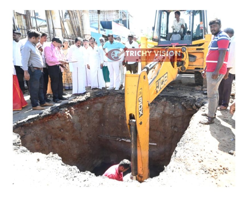 திருச்சிராப்பள்ளி மாநகராட்சி ஸ்ரீரங்கம் திருவானைக்காவல் பகுதியில் இருந்து ஸ்ரீரங்கம் செல்லும் காந்தி சாலையில், நேற்று திடீர் பள்ளம் ஏற்பட்டது. இதனை மேயர் மு. அன்பழகன், மாநகராட்சி பொறியாளர்களுடன் இன்று நேரில் பார்வையிட்டு ஆய்வு செய்தார்.