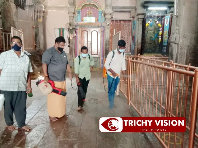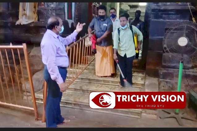 கோயில் இணை ஆணையர் ஜெயராமன் முன்னிலையில் கிருமி நாசினி தெளித்து சுத்தம் செய்யப்பட்டது.