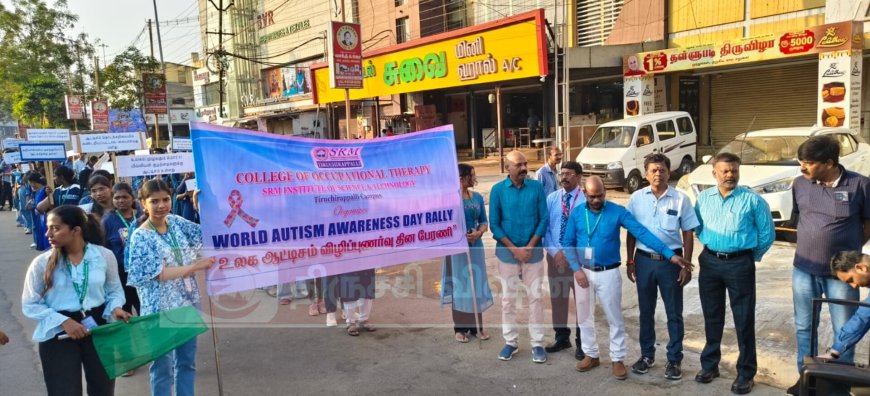 திருச்சி எஸ்.ஆர்.எம் கல்லூரி சார்பில் உலக புறவுலக (WORLD AUTISM DAY) சிந்தனையற்றோருக்கான விழிப்புணர்வு தினத்தை முன்னிட்டு திருச்சி சத்திரம் பேருந்து நிலையத்திலிருந்து மாணவ, மாணவிகளின் விழிப்புணர்வு பேரணி