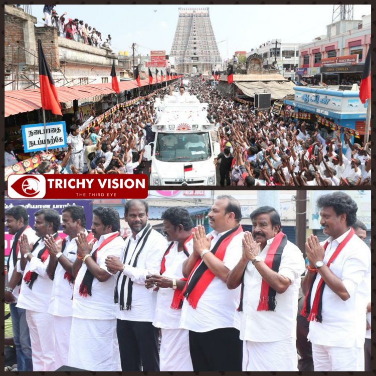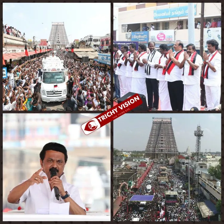 திருச்சி மாவட்டத்தில் 9 சட்டமன்ற தொகுதிகளில் போட்டியிடும் தி.மு.க மற்றும் கூட்டணி கட்சியின் வேட்பாளர்களை ஆதரித்து திருச்சி ஸ்ரீரங்கம் ராஜகோபுரம் அருகே தி.மு.க தலைவர் ஸ்டாலின் பிரச்சாரம் மேற்கொண்டார்.வேட்பாளர்களுக்கு வாக்குகளை கேட்டார்.