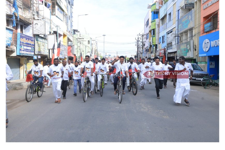 சேலத்தில் டிசம்பர் 17 அன்று நடைபெற உள்ள மாநில இளைஞர் அணியின் இரண்டாவது மாநில மாநாட்டை முன்னிட்டு திருச்சி கிழக்கு மாநகர இளைஞரணி அமைப்பாளர் திராவிடப் பண்ணை முத்து தீபக் ஏற்பாட்டில் மாபெரும் சைக்கிள் பேரணி சிந்தாமணி அண்ணா சிலை அருகில் இருந்து திருச்சி தெற்கு மாவட்ட கழக செயலாளர் பள்ளிக் கல்வித்துறை அமைச்சர் அன்பில் மகேஸ் பொய்யாமொழி, தலைமையில்