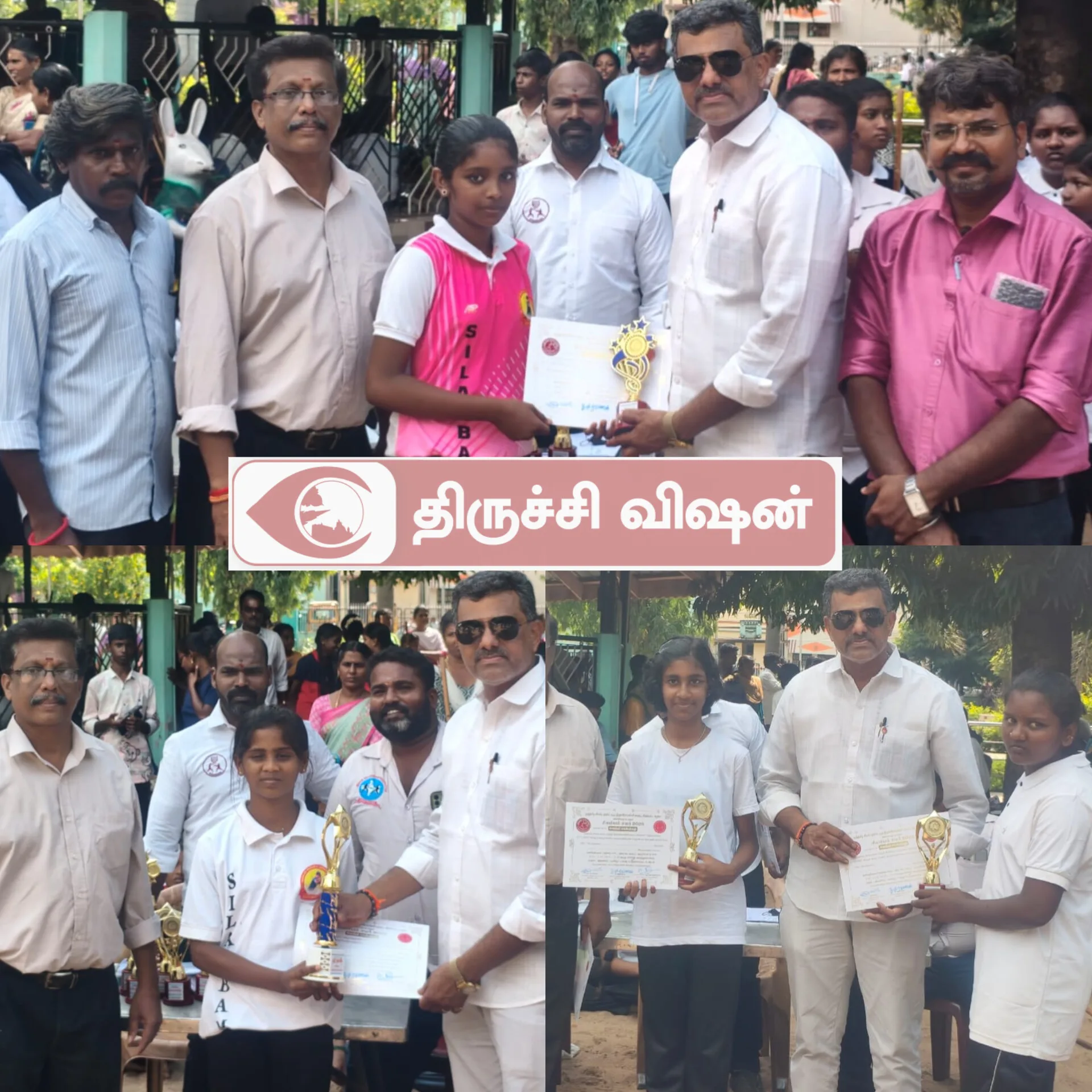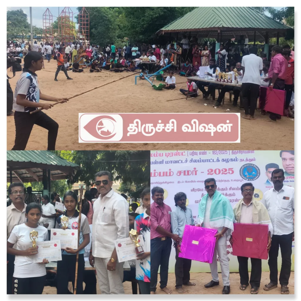 திருச்சி முத்தமிழ் சிலம்பம் டிரஸ்ட் சார்பாக உறையூரில் மாநில அளவிலான சிலம்பாட்ட போட்டி காலை தொடங்கி மாலை வரை நடைபெற்றது இப்போட்டியில் 16 மாவட்டங்களில் இருந்து 900 திற்கும் மேலான மாணவ, மாணவிகள் கலந்து கொண்டனர் மதியம் நடைபெற்ற போட்டியில் வெற்றி பெற்றவர்களை