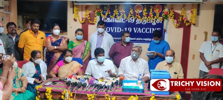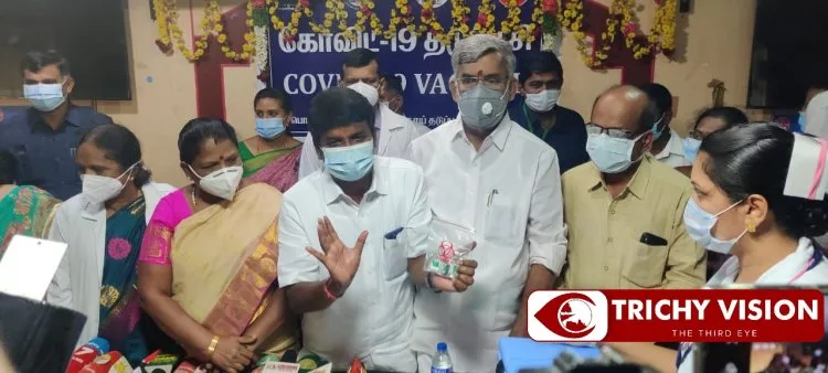 தமிழகத்தில் 5,36,500 கோவிட் தடுப்பூசி உள்ளது. முதல்கட்டமாக 6 லட்சம் தடுப்பூசிகள் போடுவதற்கு முன்பதிவு செய்யப்பட்டுள்ளது. திருச்சி மண்டலத்தில் 68,800 தடுப்பூசி புதுக்கோட்டை, திருவாரூர், கரூர், அரியலூர், நாகப்பட்டினம் உள்ளிட்ட 9 மாவட்டங்களுக்கு வந்துள்ளது. இந்த மாவட்டங்களில் 307 இடங்களில் தடுப்பூசி முகாம் ஏற்படுத்தப்பட்டுள்ளது. ஒரு நாளைக்கு 100 பேருக்கு தடுப்பூசி போடப்படுகிறது.