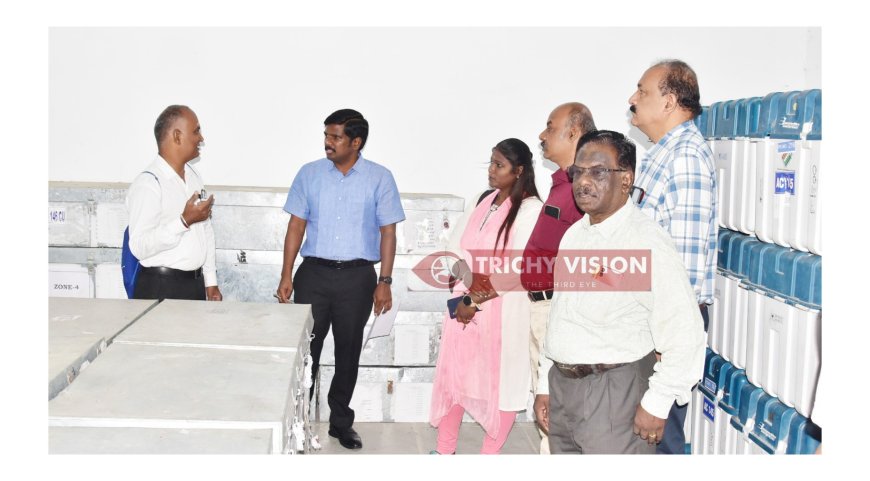 திருச்சி மாவட்ட ஆட்சியர்அலுவலகத்தில் உள்ள மின்னணு வாக்குப்பதிவு இயந்திர வைப்பறையில் அனைத்து அங்கீகரிக்கப்பட்ட அரசியல்கட்சி பிரதிநிதிகள் முன்னிலையில் மாவட்ட ஆட்சியரும், மாவட்ட தேர்தல் அலுவலருமான பிரதீப்குமார் ஆய்வுமேற்கொண்டார்.