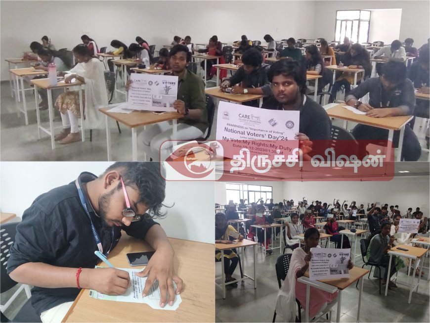 திருச்சி கேர் இன்ஜினியரிங் கல்லூரியில் நடைபெற்ற இப்போட்டியில், மாணவர்கள் தங்களின் சகாக்கள் மற்றும் குடும்ப உறுப்பினர்களை தேர்தல் பணியில் தீவிரமாக பங்கேற்க வலியுறுத்தி கடிதங்களை எழுதினர். ஒவ்வொரு கடிதமும் வாக்களிப்பது ஒரு உரிமை மற்றும் கடமை ஆகிய இரண்டையும் ஆராய்ந்து, நாட்டின் எதிர்காலத்தை வடிவமைப்பதில் அதன் முக்கிய பங்கை எடுத்துக்காட்டுகிறது. தன்னார்வலர்களின் உற்சாகமான பங்கேற்பானது, இந்த ஆண்டு தேசிய வாக்காளர் தினத்தின் கருப்பொருளுடன் எதிரொலித்தது. வலுவான மற்றும் துடிப்பான ஜனநாயகத்திற்கு பங்களிக்க வேண்டும்.