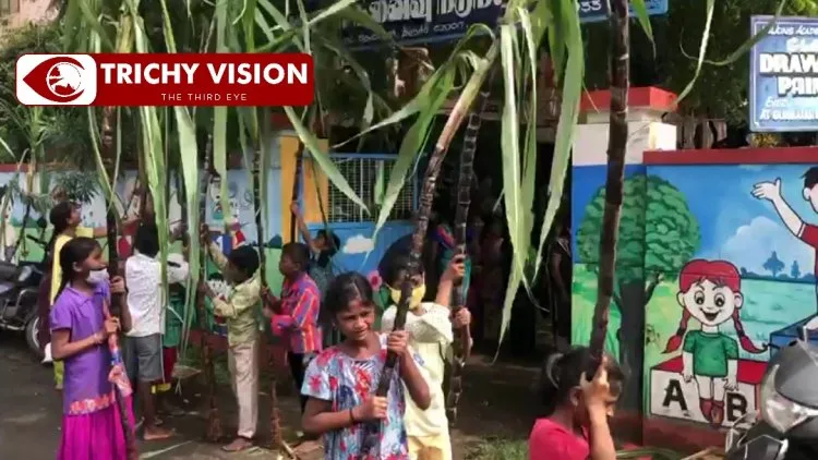 திருச்சி மத்திய சிறையில் இயற்கை முறையில் விளைந்த கரும்புகளை அரசு பள்ளி மாணவர்கள் மகிழ்ச்சியோடு பெற்றுக்கொண்டனர்.