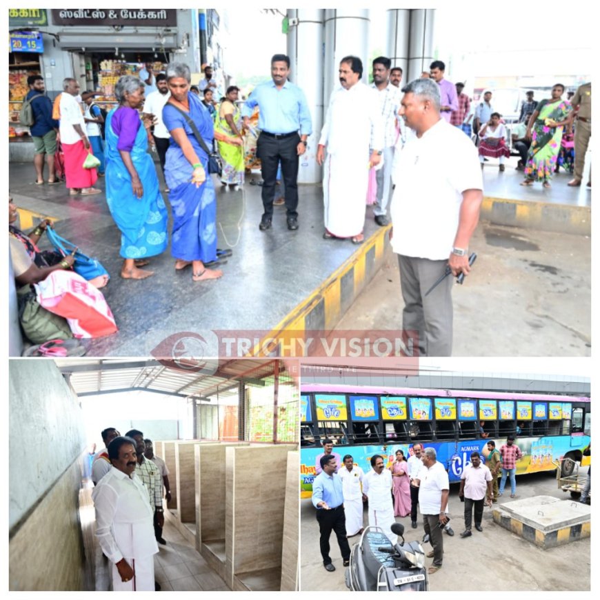 திருச்சிராப்பள்ளி மாநகராட்சி சத்திரம் பேருந்து நிலையத்தில் சுகாதார பணிகள் குறித்து மேயர் மு. இன்று உதவி ஆணையர், செயற்பொறியாளர் சுகாதார அலுவலர்களுடன் திடீர் ஆய்வு மேற்கொண்டார்.