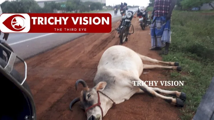 திருச்சி அருகே தேசிய நெடுஞ்சாலையில் விபத்தில் சிக்கி படுகாயங்களுடன் பசுமாடு ஒன்று உயிர் தப்பியுள்ளது.