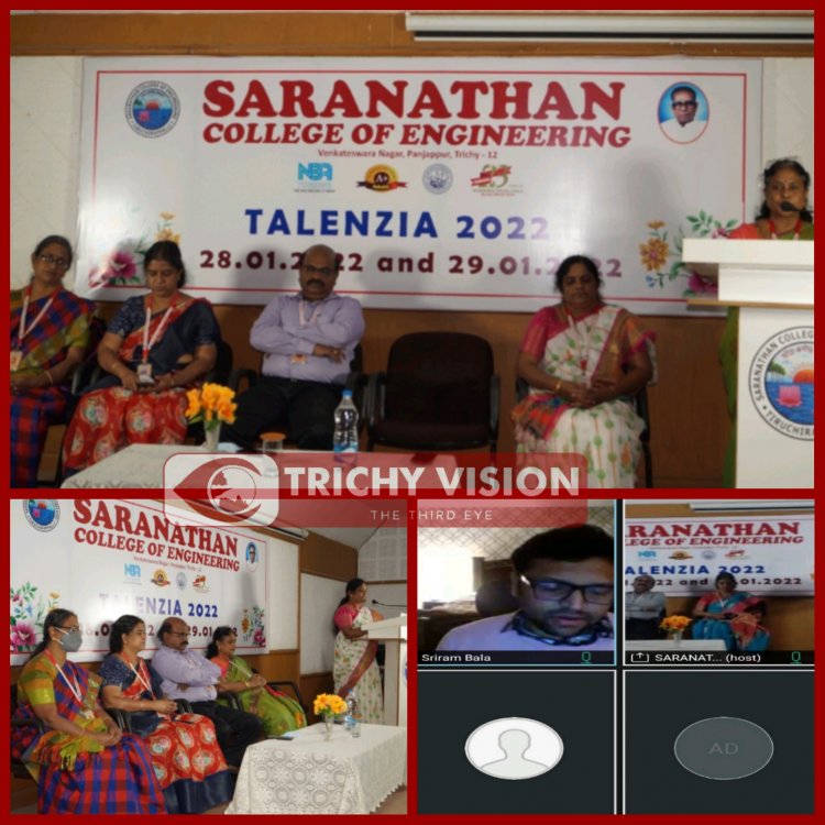 திருச்சி சாரநாதன் பொறியியல் கல்லூரி 28.1.2022 முதல் 29.1.2022 வரை பள்ளி மாணவர்களுக்கான பள்ளிகளுக்கிடையோன ஆன்லைன் போட்டியான டாலேன்ஸ்யா 2022 வை நடத்தியது. 28.1.2022 அன்று, போட்டியின் தொடக்க விழா காலை 9.30 மணிக்கு வெபெக்ஸ் ஆன்லைன் தளத்தில் கடவுள் வாழ்த்துடன் தொடங்கியது. முதல்வர் முனைவர் டி.வளவன் வரவேற்றார்.