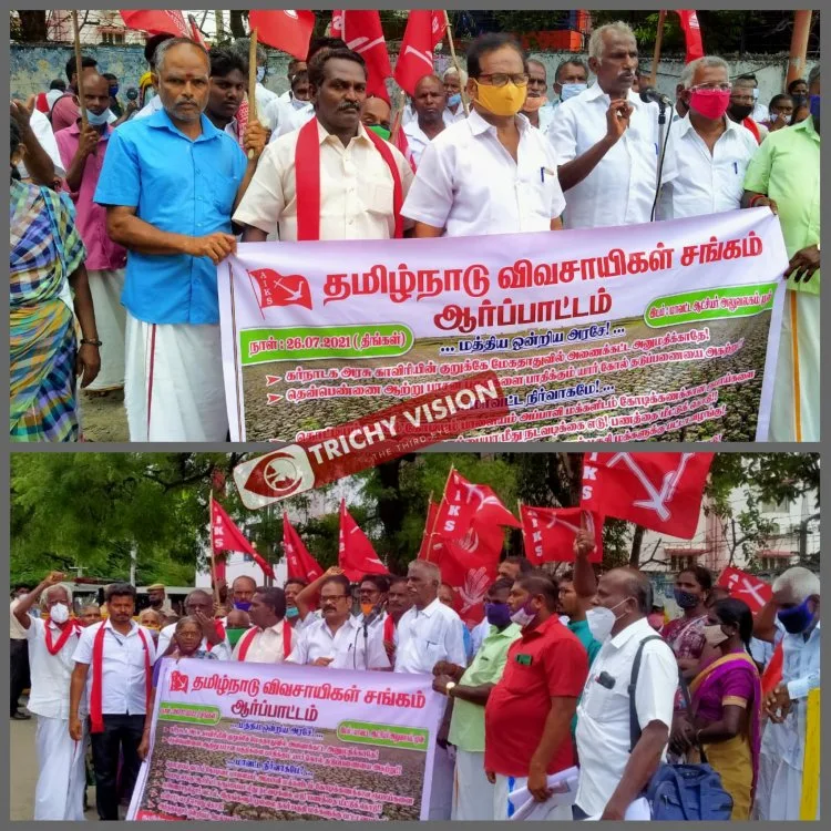 தமிழ்நாடு விவசாயிகள் சங்கம் திருச்சி மாவட்ட குழு சாா்பாக இன்று (26−07−2021)திருச்சி மாவட்ட ஆட்சியா் அலுவலகம் முன் கா்நாடக அரசு காவிாியின் குறுக்கே மேகதாட்டுவில் அணை கட்ட அனுமதி்க்க கூடாது என்று தமிழ்நாடு விவசாய சங்க மாவட்ட செயலாளர் அயிலை சிவசூாியன் தலைமையில் கண்டன ஆர்ப்பாட்டம் நடைபெற்றது.