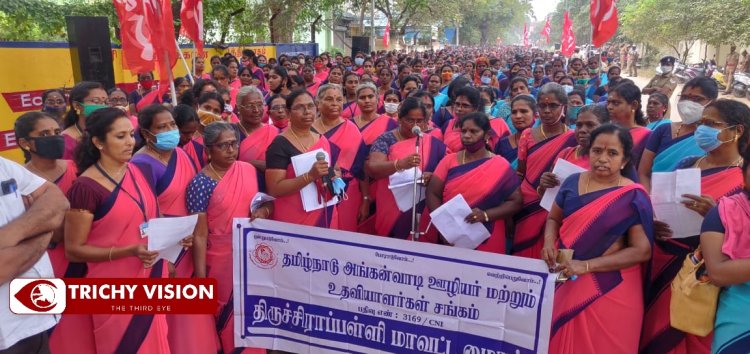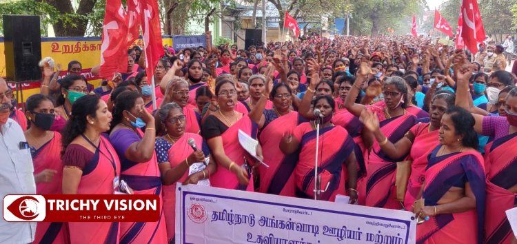 தமிழ்நாடு அங்கன்வாடி ஊழியர்கள் மற்றும் உதவியாளர்கள் மாநிலம் தழுவிய தொடர் முழக்கப் போராட்டம் திருச்சி மாவட்ட ஆட்சியர் அலுவலகம் அருகே நடைபெற்றது.