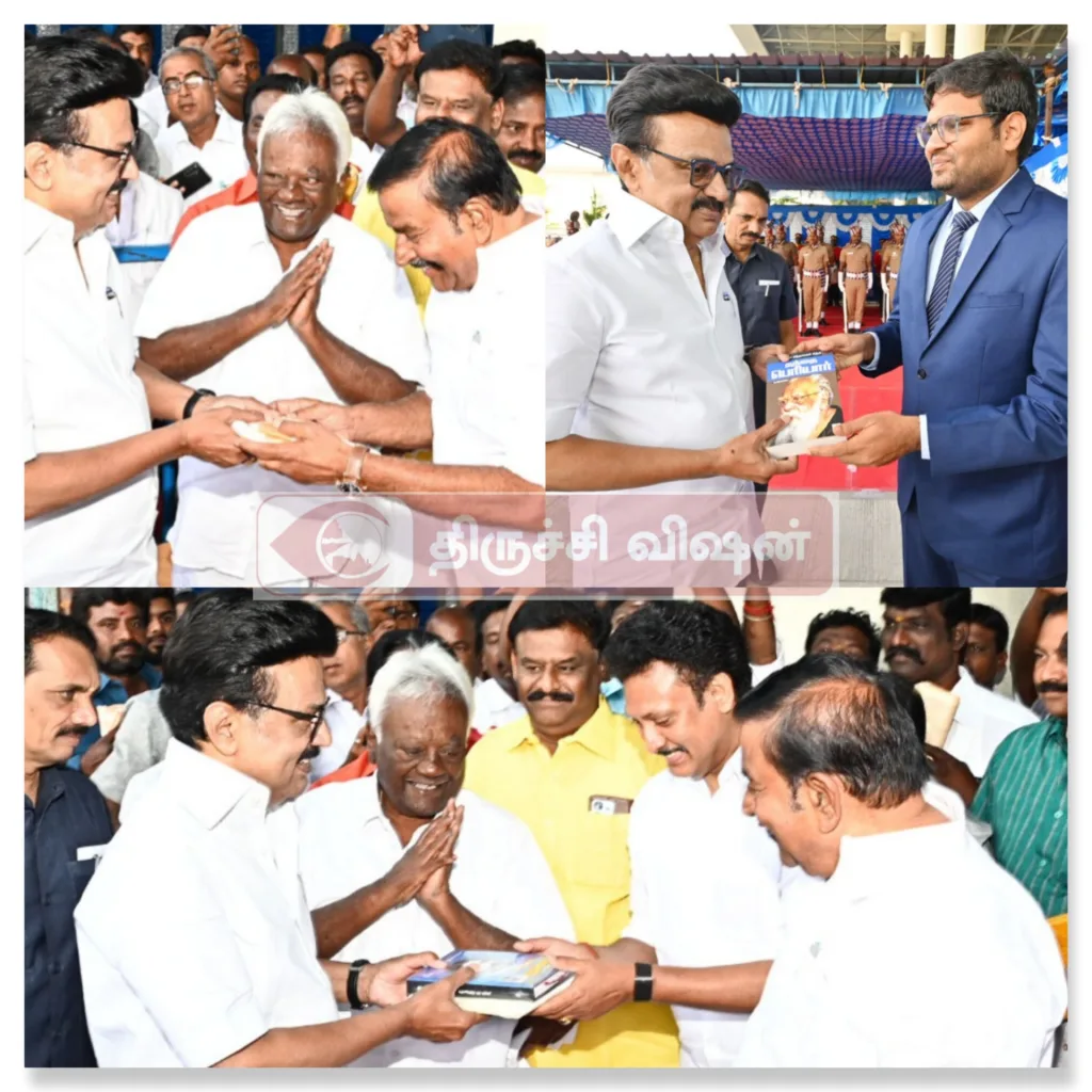 திருச்சி கலைஞர் அறிவாலயத்தில் நடைபெறும் முன்னாள் சட்டமன்ற உறுப்பினர் பரணி குமாரின் மகன் Dr.ஆதித்யா பாலா – Dr.மீனாட்சி திருமணத்தை முதலமைச்சர் மு.க.ஸ்டாலின் தலைமையேற்று நடத்தி வைக்க வருகை தந்தார் முன்னதாக சென்னையில் இருந்து தனி விமான மூலம் திருச்சி விமான நிலையத்திற்கு வந்த