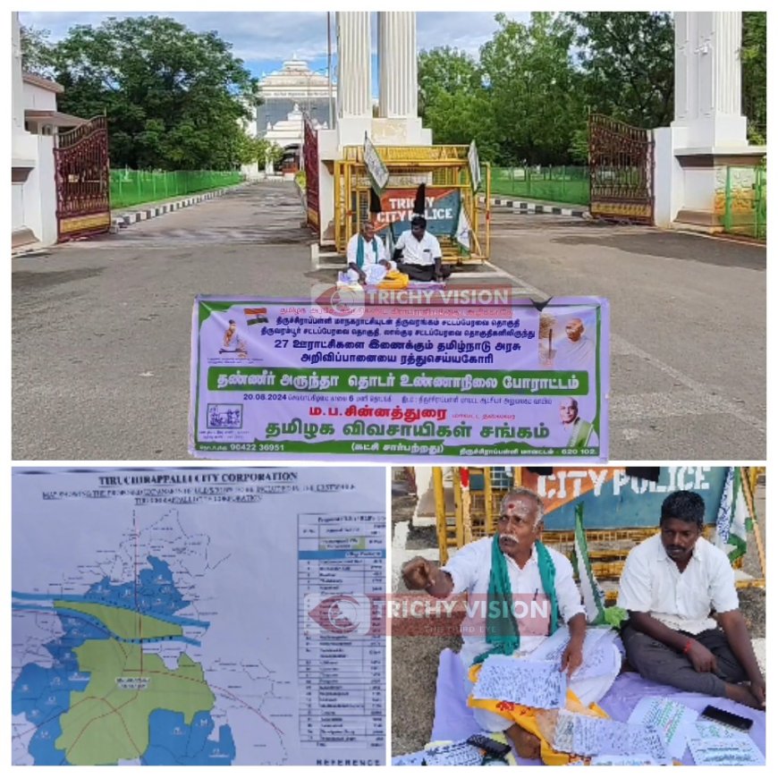 இந்நிலையில் 27 ஊராட்சிகளை இணைக்கும் வகையில் அறிவிப்பாணையை விரைவில் வெளியிட உள்ளதாக கூறப்படுகிறது. இதனை கண்டித்து இன்று காலை திருச்சி மாவட்ட ஆட்சியர் அலுவலகம் முன்பு தமிழக விவசாய சங்கத்தின் மாவட்ட தலைவர் ம.ப.சின்னதுரை மற்றும் நிர்வாகி ஆகியோர் ஊராட்சிகளை திருச்சி மாநகராட்சியுடன் இணைப்பதை கண்டித்து தொடர் தண்ணீர் அருந்தா போராட்டத்தில் ஈடுபட்டு வருகின்றனர்.