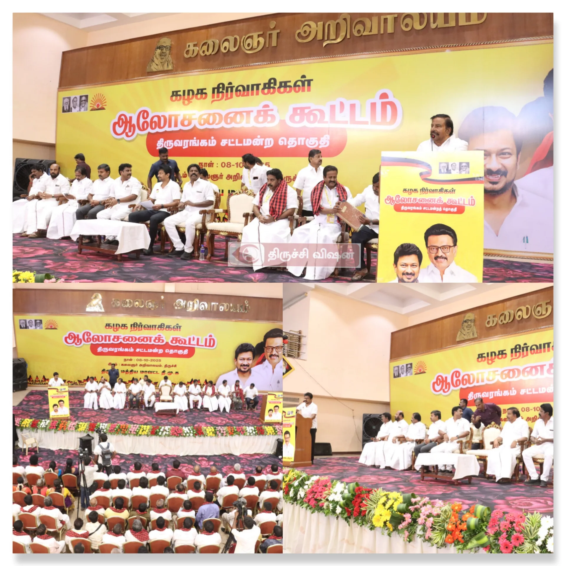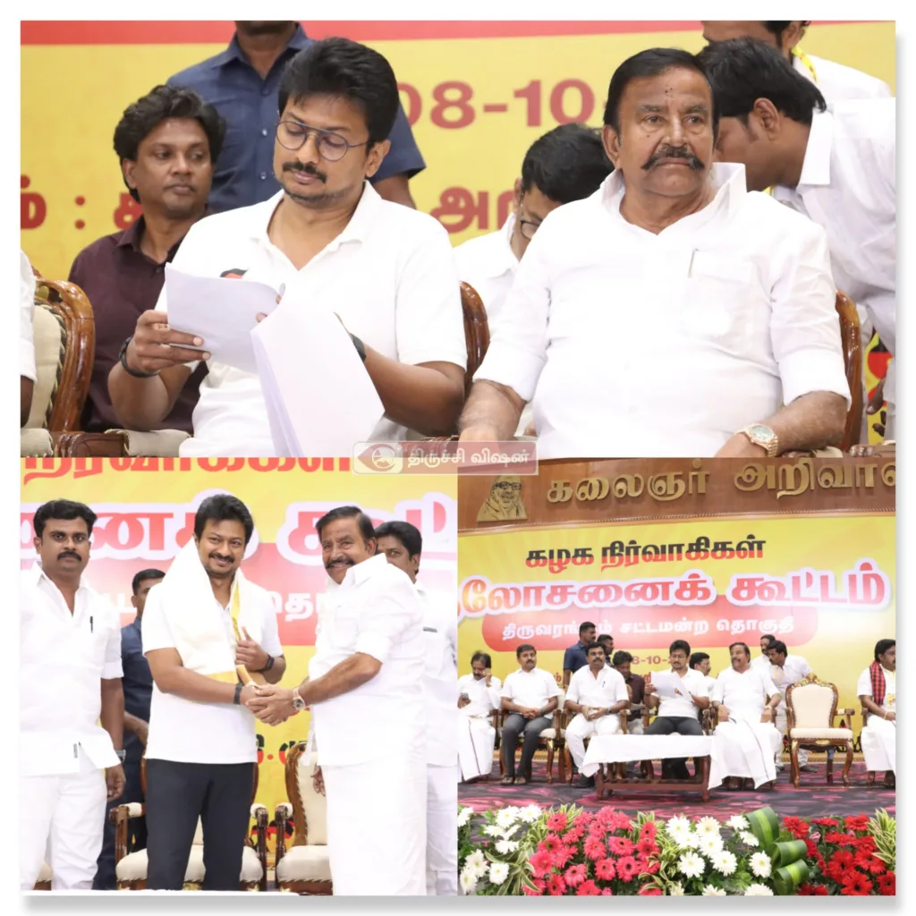 திருச்சி ஸ்ரீரங்கம் தொகுதி திமுக நிர்வாகிகள் ஆலோசனை கூட்டம் திருச்சி கலைஞர் அறிவாலயத்தில் இன்று நடைபெற்றது. இந்த கூட்டத்தில் துணை முதல்வரும், திமுக இளைஞரணி செயலாளருமான உதயநிதி ஸ்டாலின் கலந்து கொண்டு ஆலோசனைகள் வழஙகினார். இந்த நிகழ்ச்சியில் அமைச்சர் கே.என்.நேரு சட்டமன்ற உறுப்பினர்கள் தியாகராஜன், பழனியாண்டி, செளந்தரராஜன், ஸ்டாலின் குமார் உள்ளிட்டோர் கலந்து கொண்டனர்.
