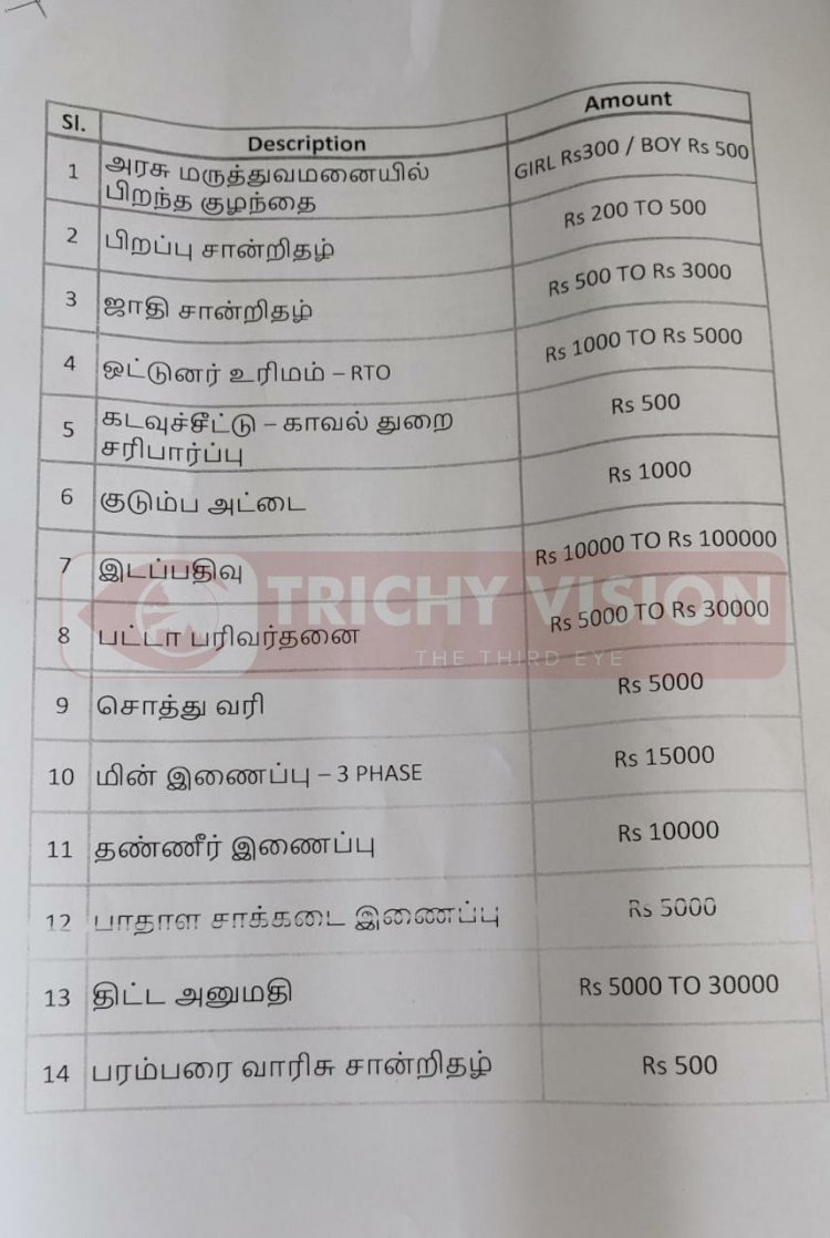 திருச்சியில் பிரச்சாரத்தை மேற்கொண்டு வரும் மக்கள் நீதி மையம் தலைவர் கமல்ஹாசன் இன்று செய்தியாளர்களை சந்தித்தார். அப்போது அரசுத் துறையில் சான்றிதழ், மின்னிணைப்பு. உள்ளிட்டவைகளுக்கு எவ்வளவு லஞ்சம் கொடுக்க வேண்டி இருக்கிறது என்பது குறித்த லஞ்ச பட்டியலை அவர் வெளியிட்டார்.