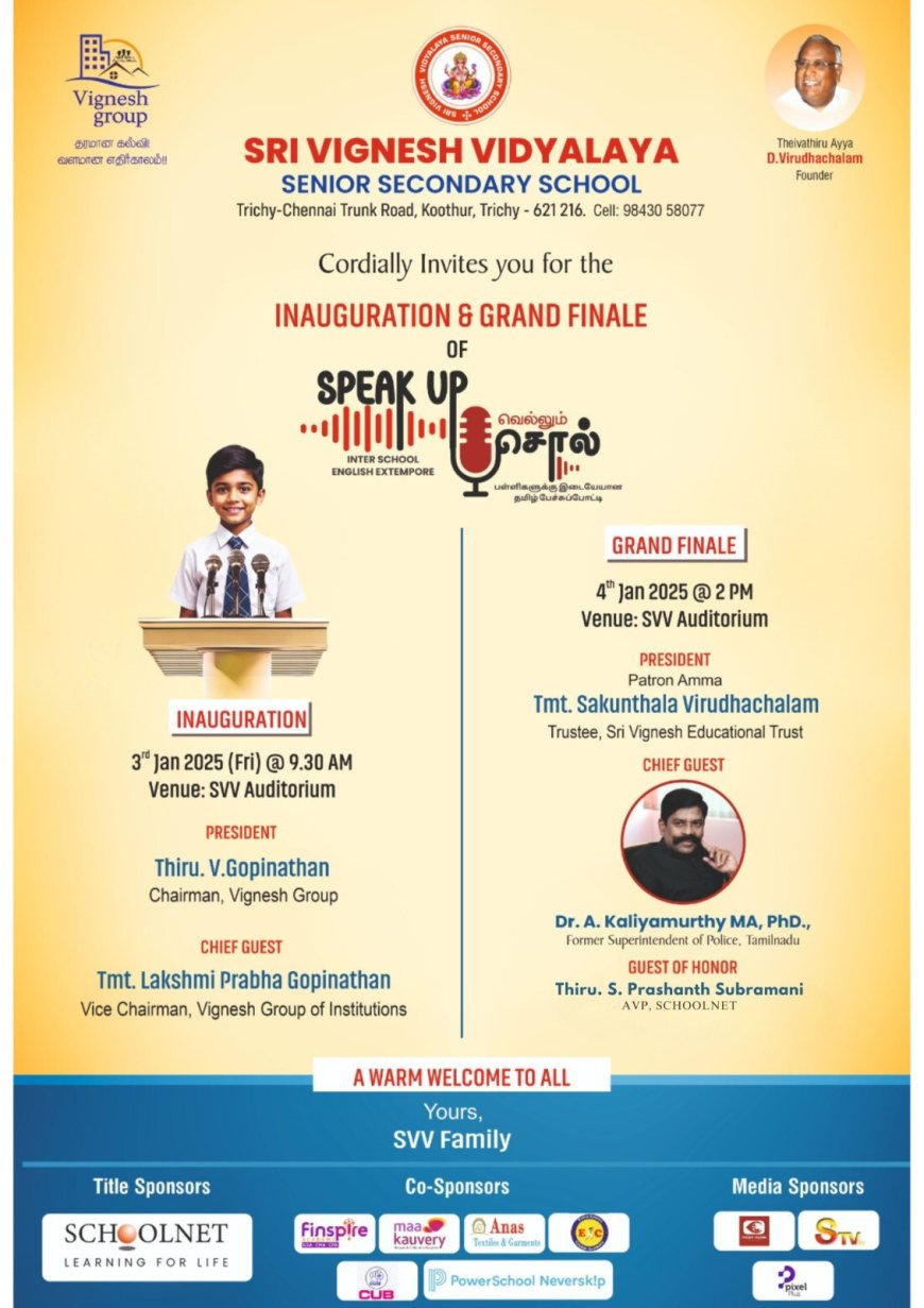 திருச்சி Sri Vinesh Vidyalaya Senior Secondary School நடத்தும் பள்ளிகளுக்கிடையே தமிழ் பேச்சு போட்டி நாளை மறுநாள் (04.01.2025) இப்பள்ளியிலுள்ள SVV Auditorium-ல் நடைபெற உள்ளது.
