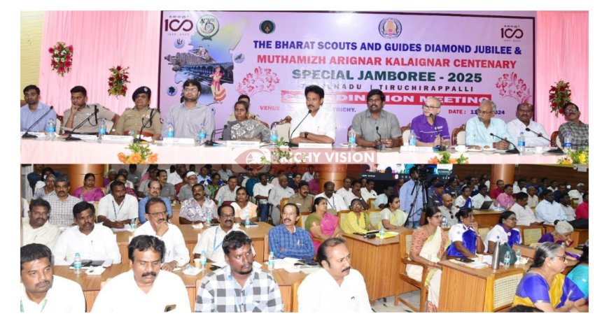 திருச்சி மாவட்டம், மணப்பாறை சிப்காட் வளாகத்தில் தமிழ்நாடு பாரத சாரண சாரணியர் இயக்க வைரவிழா மற்றும் முத்தமிழறிஞர் கலைஞர் அவர்களின் நூற்றாண்டு பெருந்திரளணி நடைபெறவுள்ளதை முன்னிட்டு அனைத்து துறை அலுவலர்களுடனான முன்னேற்பாடு பணிகள் தொடர்பான கூட்டம்