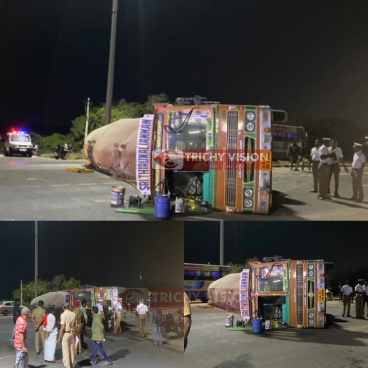 கர்நாடகாவைச் சேர்ந்த டேங்கர் லாரி பென்னாகரத்தில் இருந்து 40 டன் சிமெண்ட் ஏற்றுக்கொண்டு தூத்துக்குடி துறைமுகம் நோக்கி சென்றது. அப்போது திருச்சி – மதுரை தேசிய நெடுஞ்சாலையில் உள்ள திருச்சி பஞ்சப்பூர் பகுதியில் டேங்கர் லாரி வந்த கொண்டிருந்த போது அங்கிருந்த