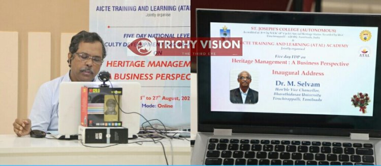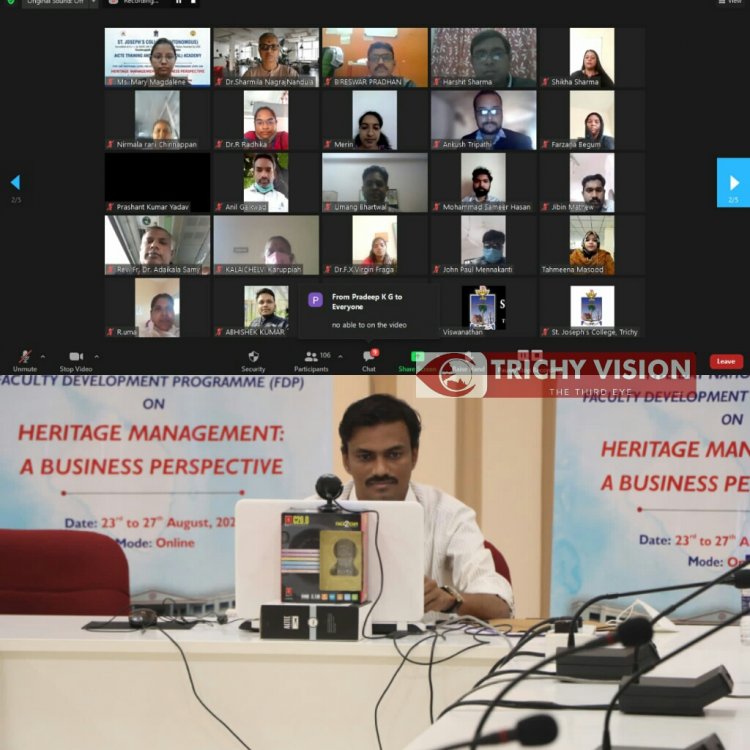 மேலும் அவர் கூறுகையில் திருச்சியில் 177 ஆண்டுகளாக தனித்துவத்தோடு பல்வேறு சிறப்புகளோடு கல்வியாளர்களை உருவாக்குவதில் சிறந்து விளங்கி கொண்டிருப்பதாக ஜோசப் கல்லூரியைப் பற்றி கூறினார். இந்த ஐந்து நாட்கள் நடைபெற்ற ஆசிரியர் திறன் மேம்பாட்டு பயிற்சியானது “Heritage manegment: A bussiness perspective” என்ற கருப்பொருளுடன் நடைபெற்றது. விழாவில் தொல்லியல் துறை சார்ந்த நிபுணர்களும் கலந்து கொண்டனர். அகமதாபாத் பல்கலைக்கழகம், அமிட்டி பல்கலைக்கழகம் மற்றும் புனிதவளனார் ஜோசப் கல்லூரி மற்றும் பாரதிதாசன் பல்கலைக்கழகத்தில் சேர்ந்தவர்களும் கலந்து கொண்டனர்.