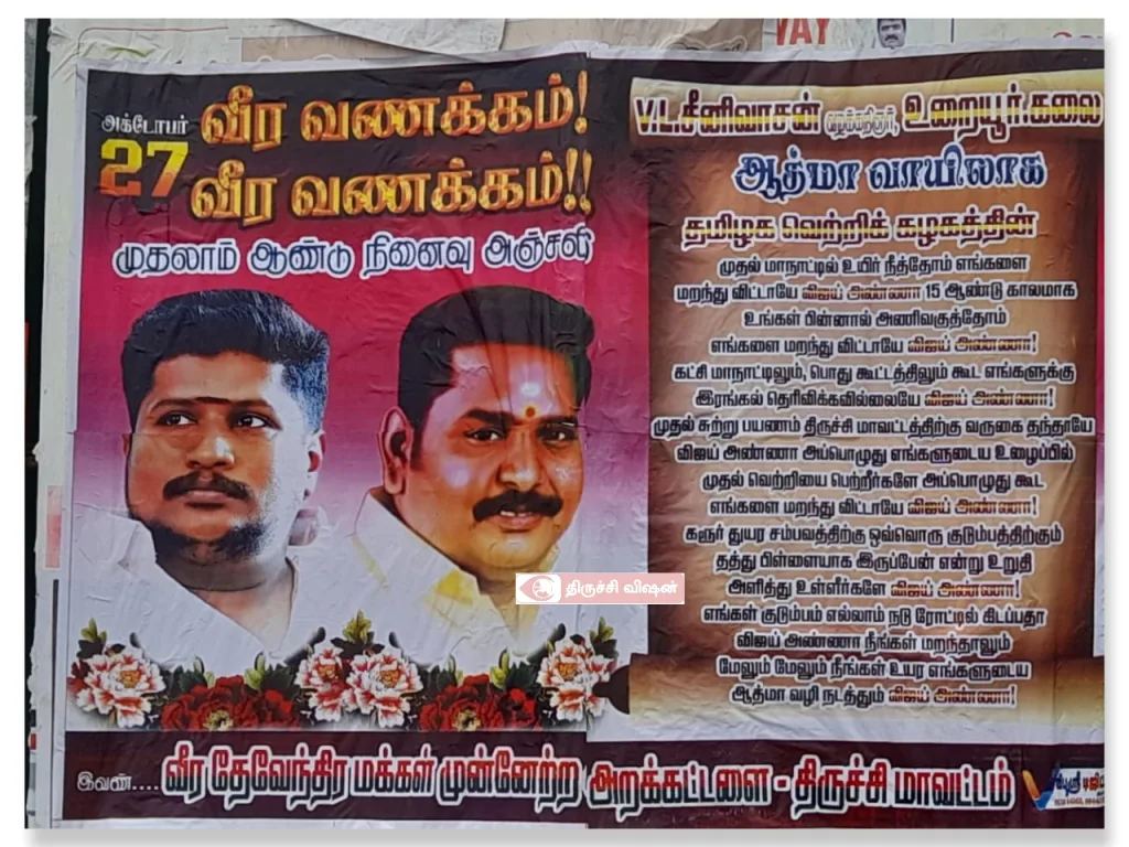 எங்கள் ஆன்மா உங்களை வழிநடத்தும் என்று தவெக தலைவர் விஜய்க்கு தெரியப்படுத்தும் விதமாக உறையூர் மற்றும் பல பகுதிகளில் மறைந்த நிர்வாகிகள் புகைப்படத்துடன் போஸ்டர்கள் ஓட்டப்பட்டுள்ளதால் பரபரப்பு ஏற்பட்டுள்ளது.