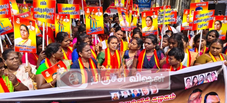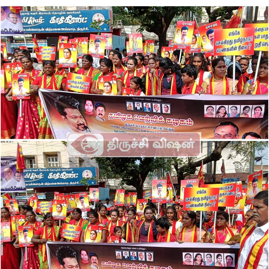 திருச்சி மாநகர் மாவட்டம் தமிழக வெற்றி கழகத்தின் மகளிர் அணி சார்பாக திருச்சி ஜங்ஷன் ரயில் நிலையம் அருகே உள்ள வழி விடு முருகன் கோவில் அருகே மாபெரும் கண்டன ஆர்ப்பாட்டம் நடைபெற்றது. பெண்களுக்கு எதிரான தொடர் பாலியல் வன்கொடுமைகளை தடுக்கவும், பெண்களுக்கு எதிராக நடக்கும் அநீதியை தடுக்க தவறிய தமிழக அரசை கண்டித்து கண்டன ஆர்ப்பாட்டம் நடைபெற்றது இதில் தமிழக அரசுக்கு எதிராக இன்னொரு பக்கம் மேற்பட்ட பெண்கள் புரட்சி நிர்வாகிகள் கலந்து கொண்டு தமிழக அரசுக்கு எதிராக கண்டன முழக்கங்களை எழுப்பினர்..