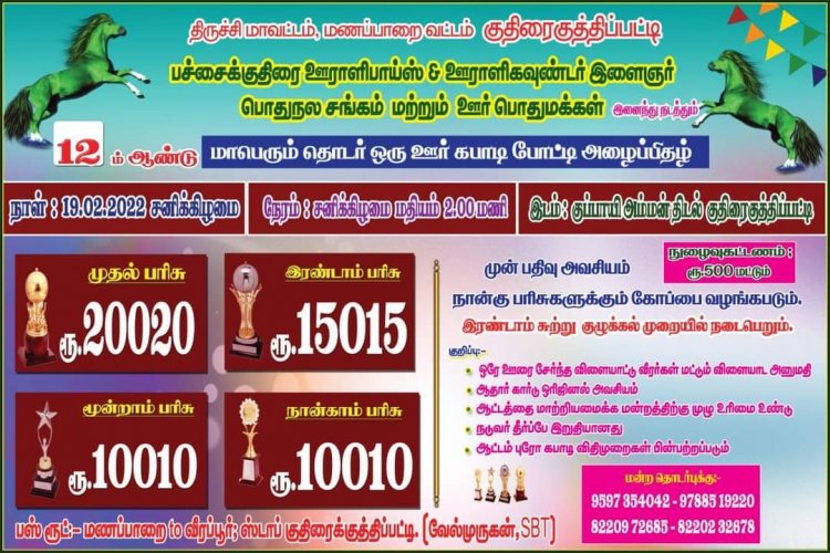 திருச்சி மாவட்டம் மணப்பாறை வட்டம் குதிரைக்குத்திப்பட்டி கிராமமும் பச்சைகுதிரை ஊராளி பாய்ஸ் மற்றும் ஊராளி கவுண்டர் இளைஞர் பொதுநலம் சங்கம் மற்றும் ஊர் பொதுமக்கள் இணைந்து நடத்தும் 12 ஆம் ஆண்டு மாபெரும் தொடர் ஒரு ஊர் கபடி போட்டி நடைபெற உள்ளது.