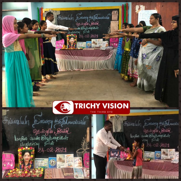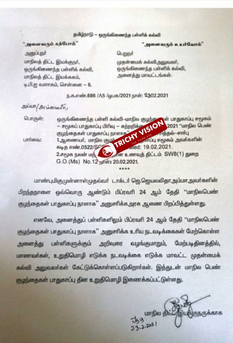 மறைந்த முன்னாள் முதல்வர் ஜெயலலிதா அவர்களின் பிறந்தநாளை ஒவ்வொரு ஆண்டும் பிப்ரவரி 24 ஆம் தேதி மாநில பெண் குழந்தைகள் பாதுகாப்பு நாளாக அனுசரிக்க அரசு ஆணை பிறப்பித்துள்ளது. எனவே அனைத்துப் பள்ளிகளிலும் மேற்படி தினத்தில் மாணவர்கள் உறுதிமொழி எடுக்க வேண்டி மாநிலத் திட்ட இயக்குநர் அவர்களின் செயல்முறை ஆணையின் பேரில் திருச்சி, தென்னூர், சுப்பையா நினைவு நடுநிலைப்பள்ளியில் இன்று மூன்றாம் பருவ விலையில்லா குறிப்பேடுகள் பெற வந்த மாணவர்கள் பள்ளி தலைமையாசிரியர் ஜீவானந்தன் தலைமையில் உறுதிமொழி எடுத்துக்கொண்டனர்.
