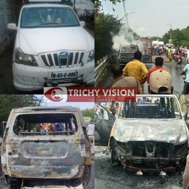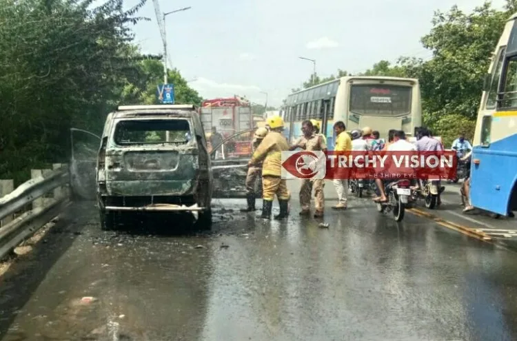 திருச்சிக்கு மறு விற்பனை செய்ய வந்த கார் திடீர் தீ பற்றி எலும்பு கூடானது