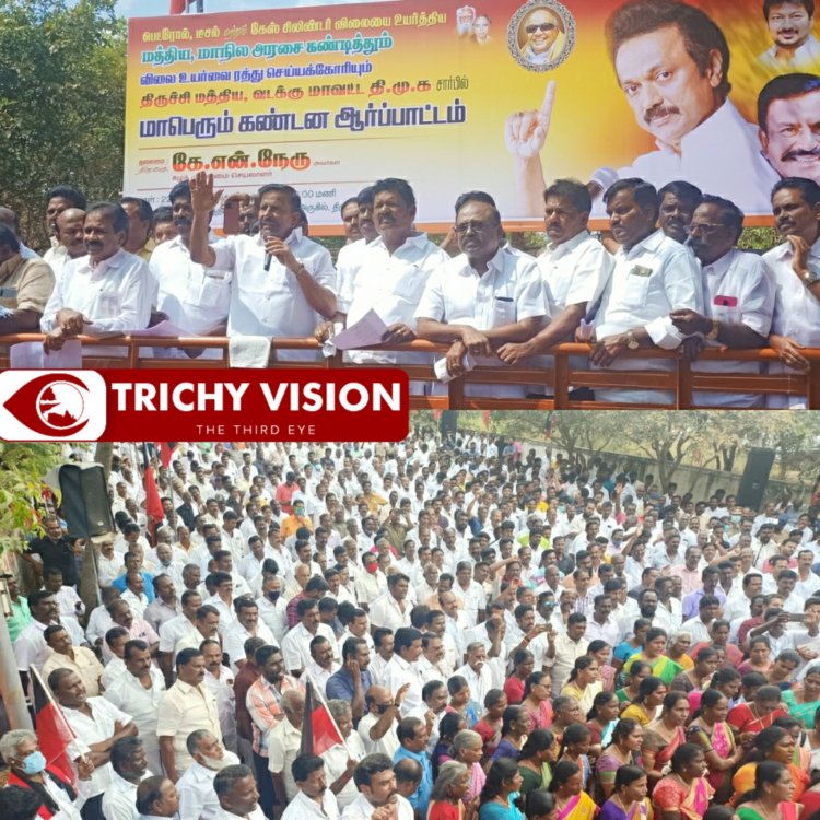 தேர்தலுக்காக தான் காவிரி குண்டாறு திட்டம் தொடங்கப்பட்டுள்ளது. திருச்சியில் திமுக முதன்மைச் செயலாளர் கே.என்.நேரு பேட்டி.பெட்ரோல், டீசல் மற்றும் கியாஸ் சிலிண்டர் விலை உயர்வை கண்டித்து திமுக சார்பில் திருச்சி மாவட்ட அலுவலகம் அருகில் ஆர்பாட்டம் நடைபெற்றது.