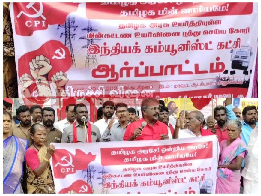 தமிழகத்தில் கடந்த சில தினங்களுக்கு முன்பு மின் கட்டணத்தை தமிழக அரசு உயர்த்தி உள்ளது இதனை திரும்ப பெறப்கோரியும், மேலும் மத்திய அரசின் உதய் மின் திட்டத்திலிருந்து தமிழக அரசு வெளியேற கோரியும், திருச்சி மாவட்ட ஆட்சியர் அலுவலகம் அருகே இந்திய கம்யூனிஸ்ட் கட்சி சார்பாக மாவட்ட செயலாளர் சிவா தலைமையில் ஆர்ப்பாட்டம் நடைபெற்றது