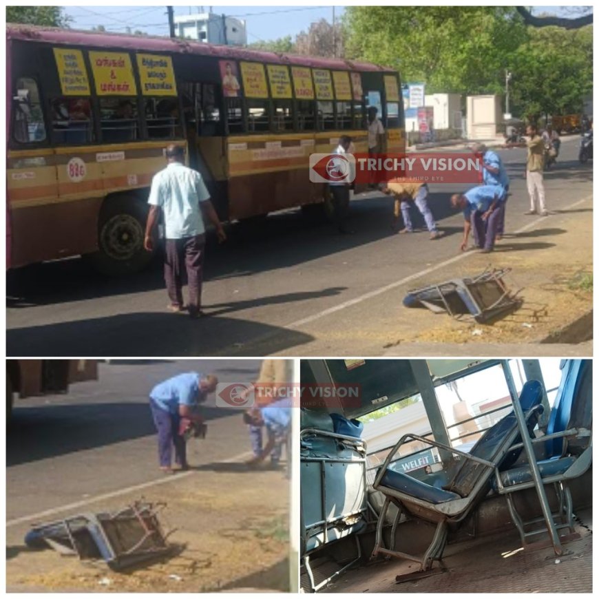 திருச்சியில் அரசு பேருந்தில் இருக்கை கழண்டு வெளியில் விழுந்த சம்பவம் அதிர்ச்சியை ஏற்படுத்தியுள்ளது. தமிழ்நாடு அரசு பேருந்துகளின் தரம் எந்த நிலையில் உள்ளது என்பதற்கு உதாரணமாக இந்த நிகழ்வு இருக்கிறது என்று சமூக ஆர்வலர்கள் குற்றம் சாட்டியுள்ளனர்.