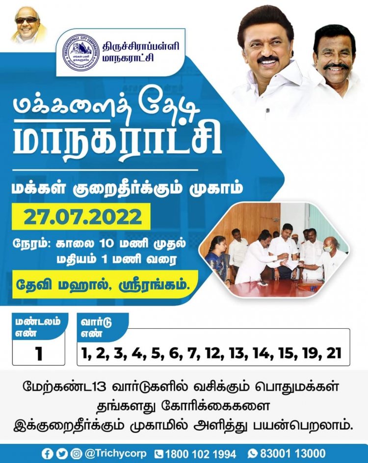 மக்களை தேடி மாநகராட்சி குறைதீர்க்கும் முகாம் வருகிற 27.07.2022 ஆம் தேதியன்று மண்டலம் எண் : 1 – ஸ்ரீரங்கம் கோட்ட அலுவலக வளாகத்தில் நடைபெற உள்ளது.