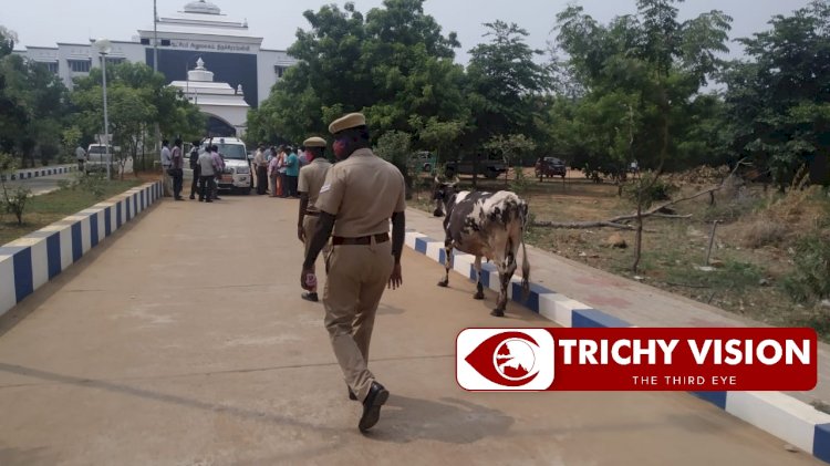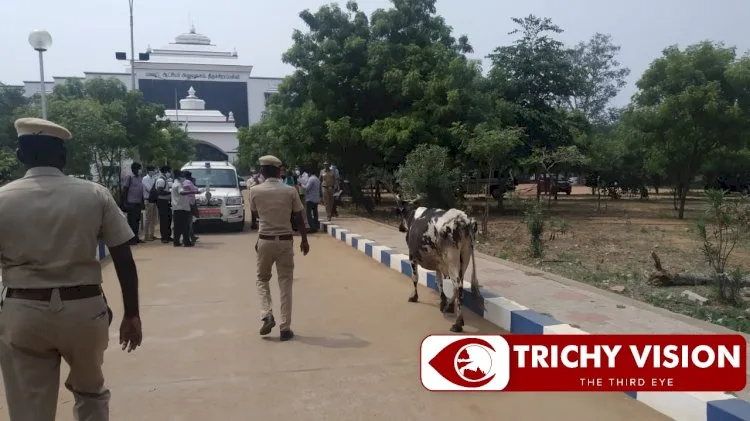 முக்கியமான மனுக்கள், போராட்டங்கள் போன்றவற்றில் காவல்துறையினரின் கண்காணிப்புடன் இருவர் மட்டுமே மாவட்ட ஆட்சியர் அலுவலகத்தில் சென்று வர அனுமதி வழங்கப்பட்டுள்ள நிலையில், காவல்துறையினரின் கட்டுப்பாட்டையும் மீறி மாவட்ட ஆட்சியர் காரை எடுத்துக் கொண்டு வெளியில் கிளம்பும் சமயம் இந்து மக்கள் கட்சியினர் மனு ஒன்றை அளிக்க வந்ததை பார்த்த மாவட்ட ஆட்சியர் காரை நிறுத்தினர், அப்போது அவர்களிடமிருந்து மாவட்ட ஆட்சியர் மனுக்களை பெற்றுக் கொண்டிருந்தபோது, மாடு ஒன்று அவர் காரை நோக்கி ஓடியது. காவல்துறையினர் அந்த மாட்டை துரத்தவும், விரட்டவும் முயன்றனர்