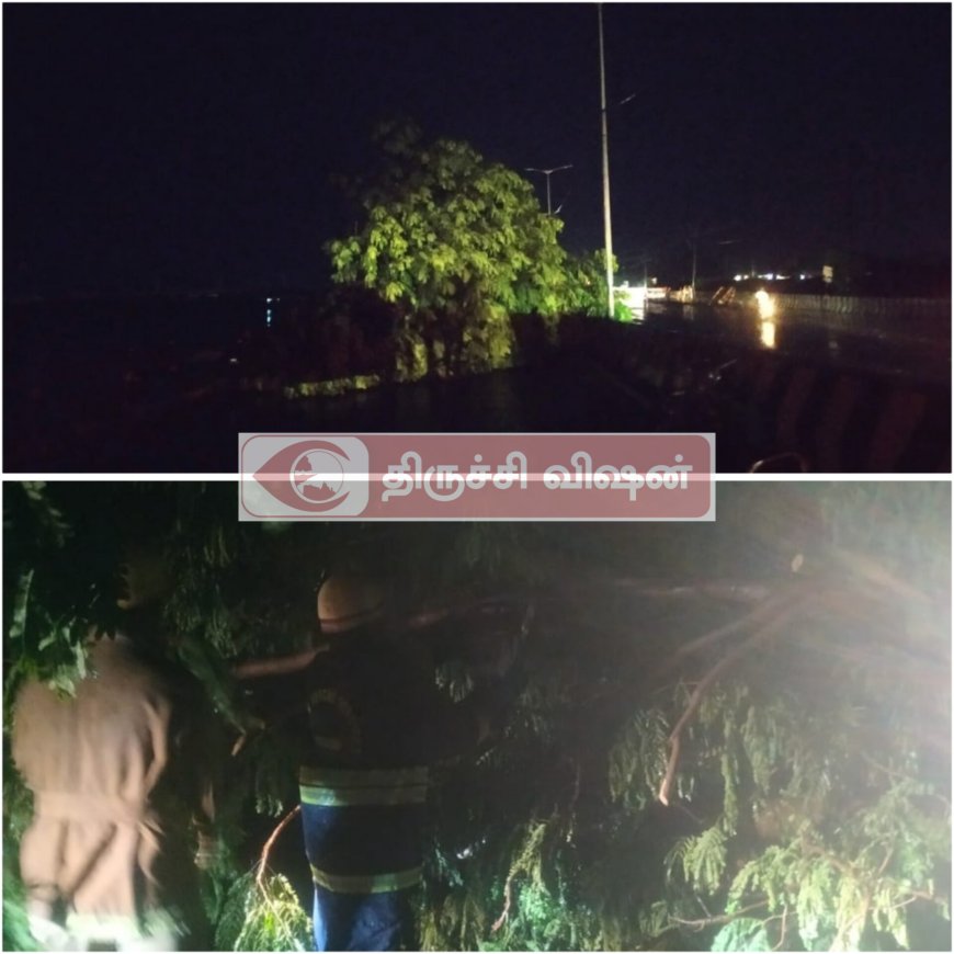 திருச்சி நிலையை எல்லைக்குட்பட்ட ஓயாமரி சுடுகாடு சாலை ஓரம் மரங்கள் முறிந்து வாகனங்களின் மேல் விழுந்த மரங்கள் அகற்றப்பட்டு தீரன் நகர் பகுதியில் விழுந்த மரங்களை அகற்றும் பணிக்கு வண்டி செல்கிறது.
