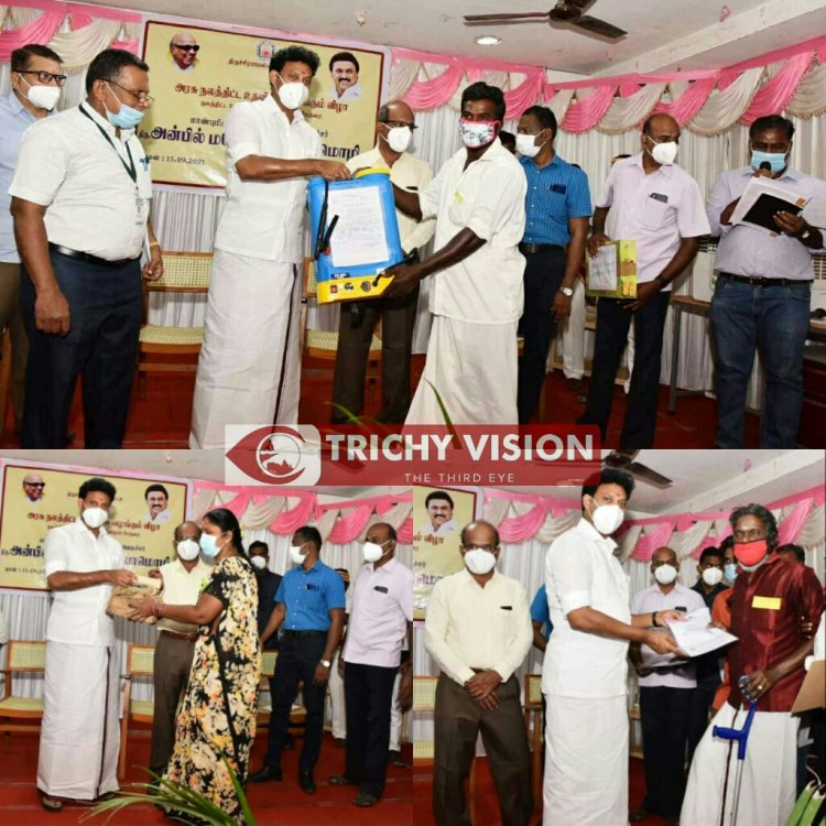 திருச்சி மாவட்டம் திருவெறும்பூர் அருகே பெல் நிறுவன சமுதாயக் கூடத்தில் நடந்த அரசு நலத்திட்ட உதவி வழங்கும் விழாவில் 88 பயணாளிகளுக்கு ரூ.35 லட்சம் மதிப்பிலான நலதிட்ட உதவிகளை தமிழக பள்ளி கல்வித்துறை அமைச்சர் அன்பில் மகேஷ் பொய்யாமொழி வழங்கினார்.