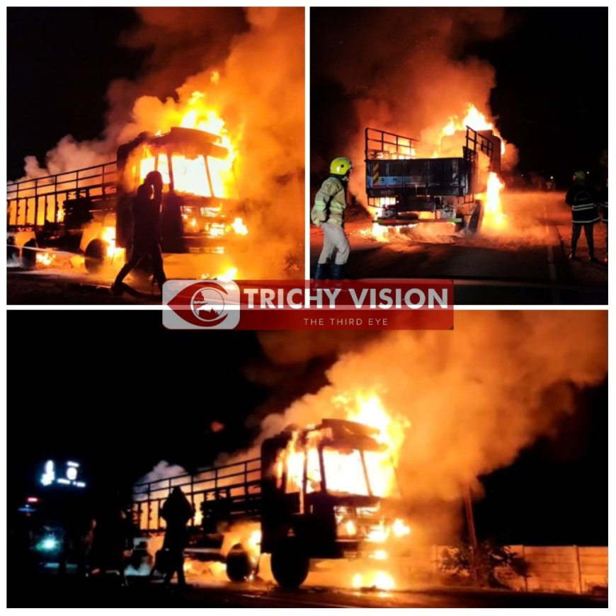 சம்பவ இடத்திற்கு வந்த பத்துக்கு மேற்பட்ட தீயணைப்பு வீரர்கள் தீயை ஒரு மணி நேரம் போராடி அணைத்தனர். இந்த தீ விபத்தால் லாரி முற்றிலும் எரிந்து எலும்புக்கூடானது. இதுகுறித்து சமயபுரம் போலீசார் சம்பவ இடத்திற்கு வந்து லாரி எரிந்தது குறித்து விசாரணை நடத்தினர்.