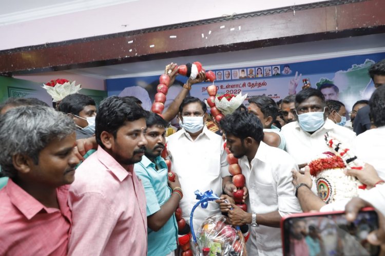 நகர்புற உள்ளாட்சி தேர்தலில் திருச்சி மாநகராட்சியில் போட்டியிடும் அதிமுக வேட்பாளர்களை ஆதரித்து மன்னார்புரத்தில் உள்ள தனியார் திருமண மண்டபத்தில் நடைபெற்ற பிரச்சார பொதுக்கூட்டத்தில் அதிமுக இணை ஒருங்கிணைப்பாளர், எதிர்கட்சி தலைவர் எடப்பாடி பழனிச்சாமி, முன்னாள் அமைச்சர்கள் ஓ.எஸ்.மணியன், காமராஜ், வெல்லமண்டி நடராஜன், வளர்மதி, பரஞ்சோதி மற்றும் முன்னாள் நாடாளுமன்ற உறுப்பினர் எம்.பி.குமார் ஆகியோர் கலந்து கொண்டனர்.
