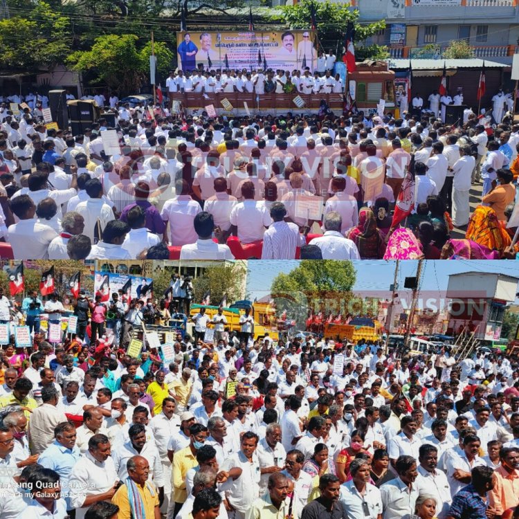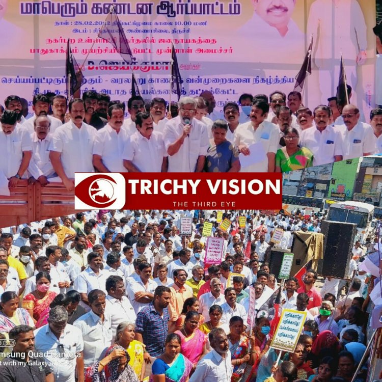 முன்னாள் அமைச்சர் ஜெயக்குமார் கைது செய்யப்பட்டதை கண்டித்து திருச்சி சத்திரம் பேருந்து நிலையம் அருகில் உள்ள அண்ணா சிலை முன்பு அதிமுகவினர் கண்டன ஆர்ப்பாட்டத்தில் ஈடுபட்டனர். இந்த ஆர்ப்பாட்டத்தில் முன்னாள் அமைச்சர்கள் வெல்லமண்டி நடராஜன், வளர்மதி, பரஞ்சோதி, முன்னாள் நாடாளுமன்ற உறுப்பினர் குமார், ரத்தினவேல் உள்ளிட்டோர் பங்கேற்றனர். பின்னர் திமுகவிற்கு எதிராக கண்டன கோஷங்களை எழுப்பி ஆர்ப்பாட்டத்தில் ஈடுபட்டுள்ளனர்.